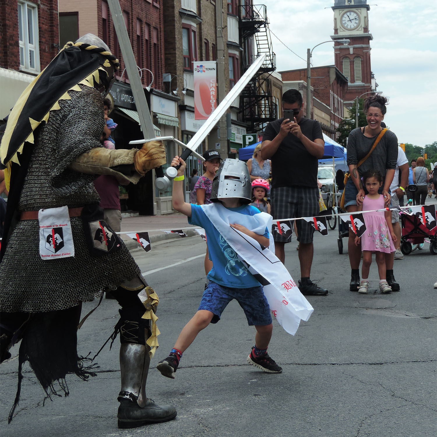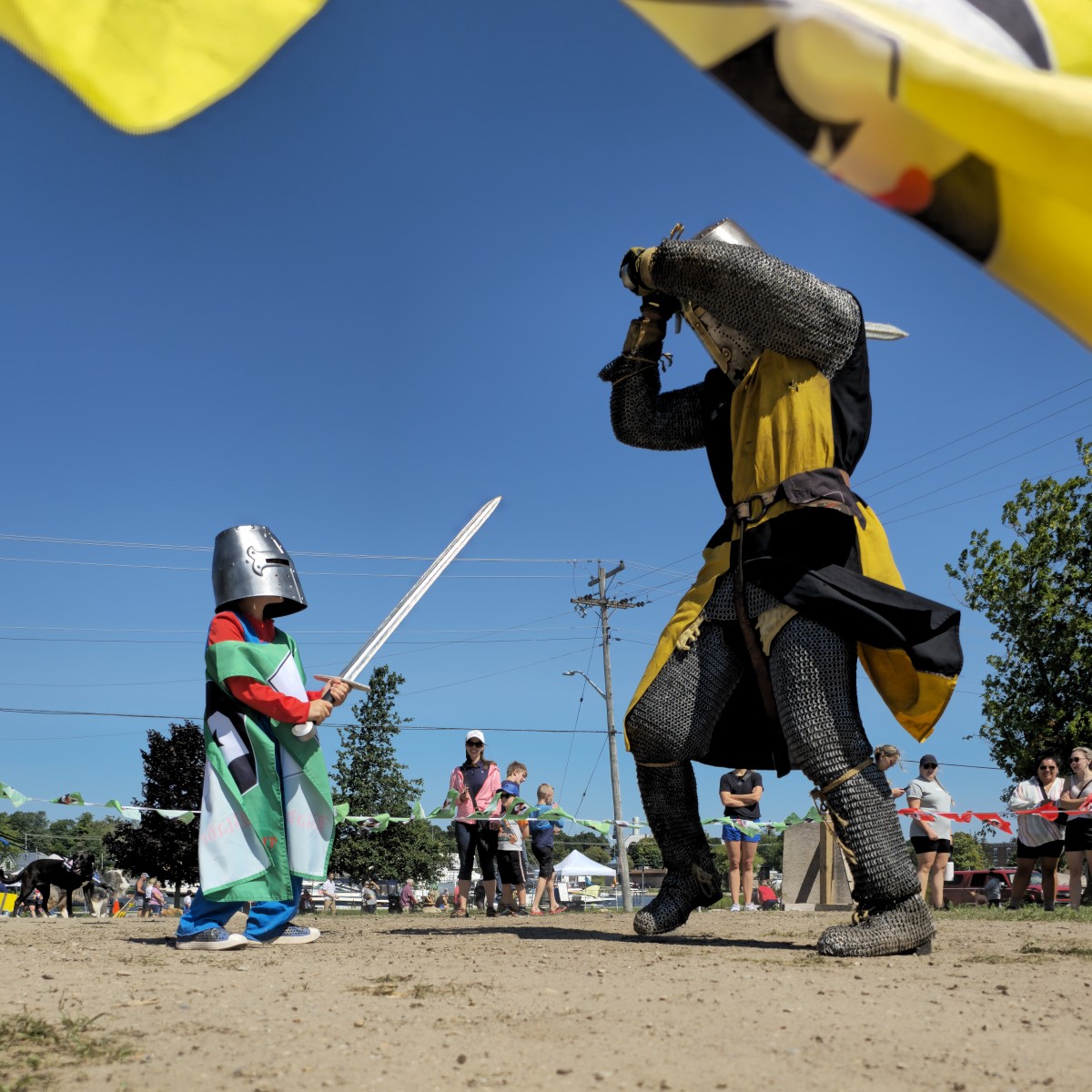 Parents love this show as they get to watch their child fight against one of our Knights. The young challenger must wear a tabard and a medieval plastic helmet. They both use a foam sword, but they must respect the honour of the list. They must bow at the start of the duel to their opponent to show respect and they must give the Knight a High 5 at the end of the match to show that they are still friends.